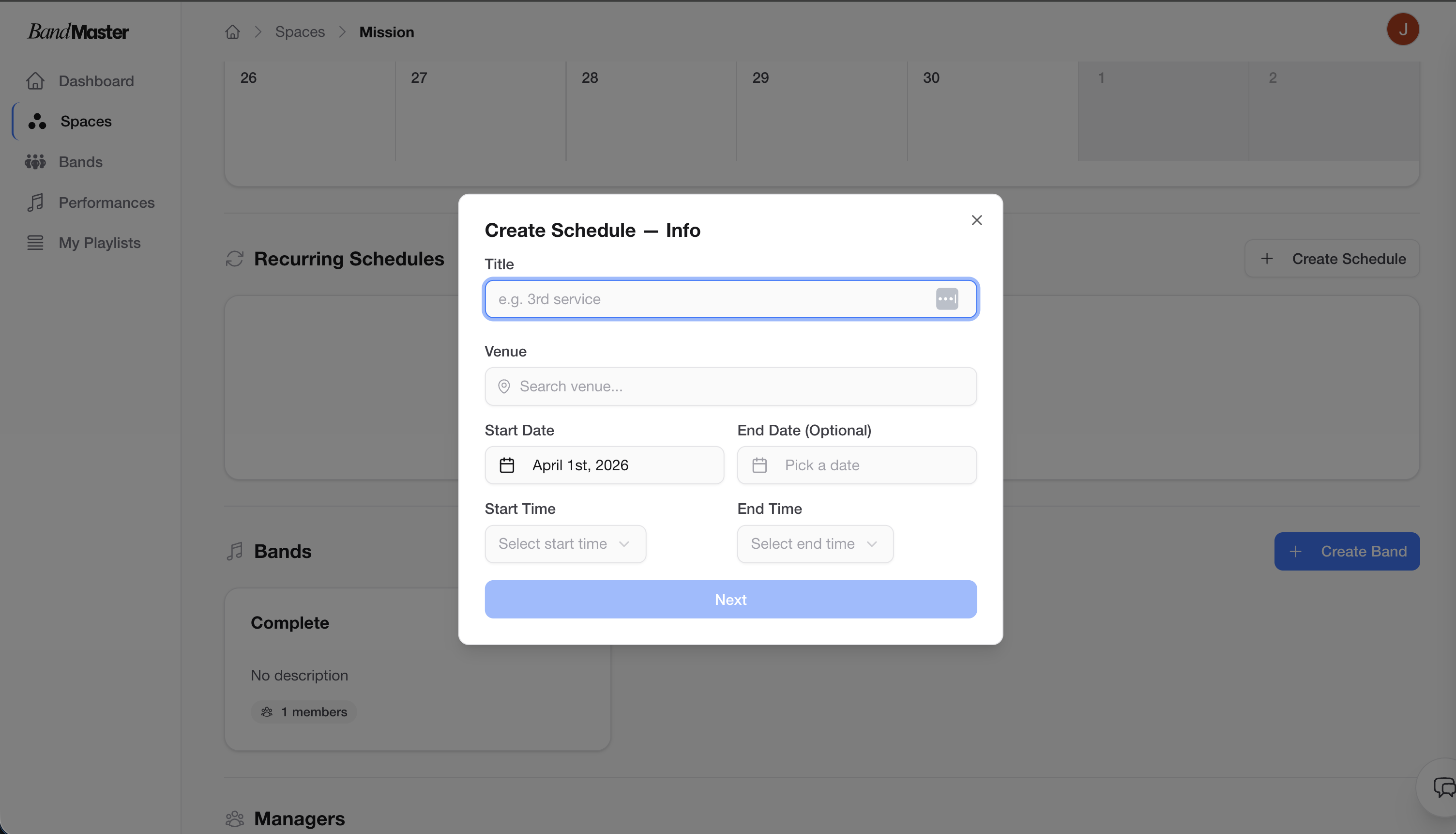 A Schedule defines a repeating pattern for performances. When you save a schedule, Bandmaster generates individual performance entries for every occurrence between the start and end date.