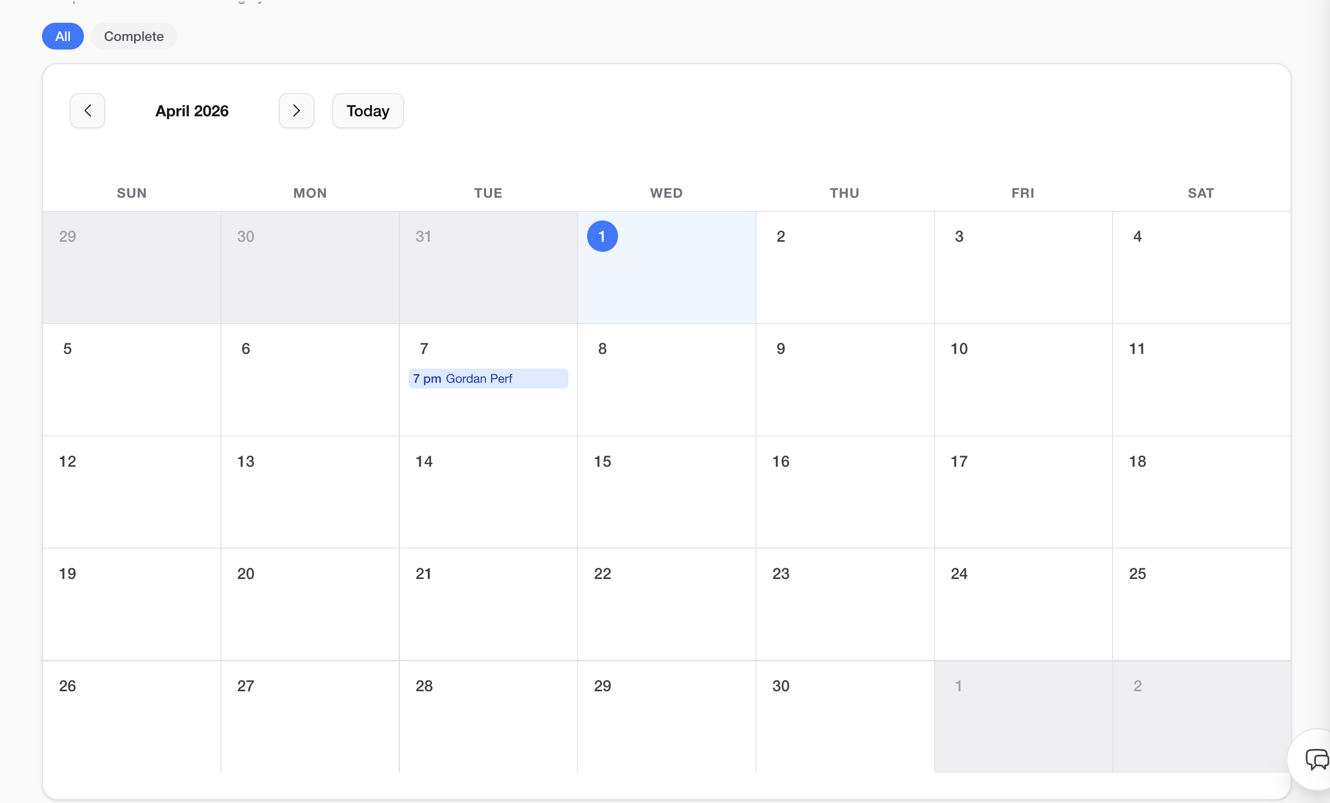 - Calendar view — a monthly calendar showing performances as dots or event blocks on each day