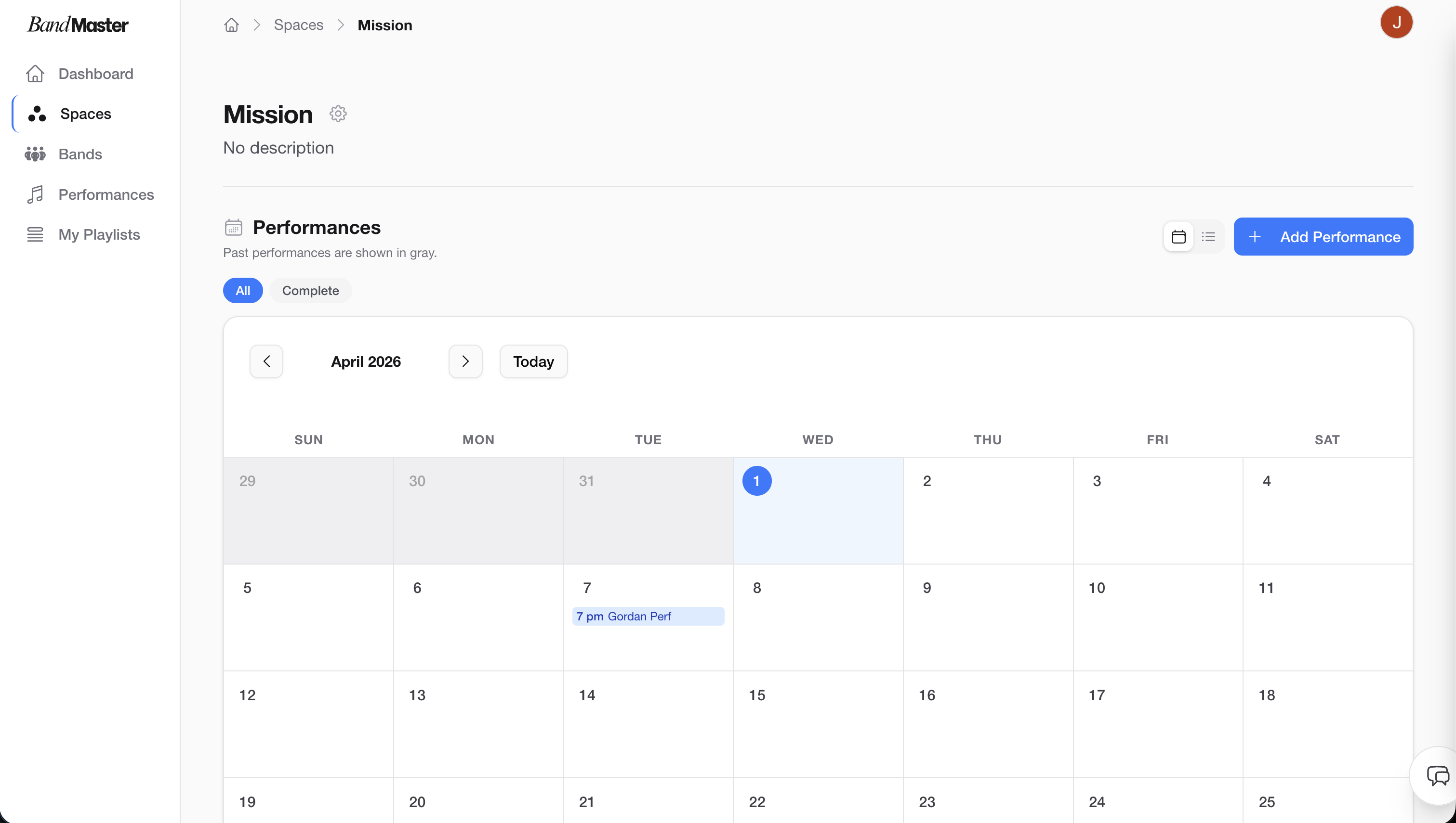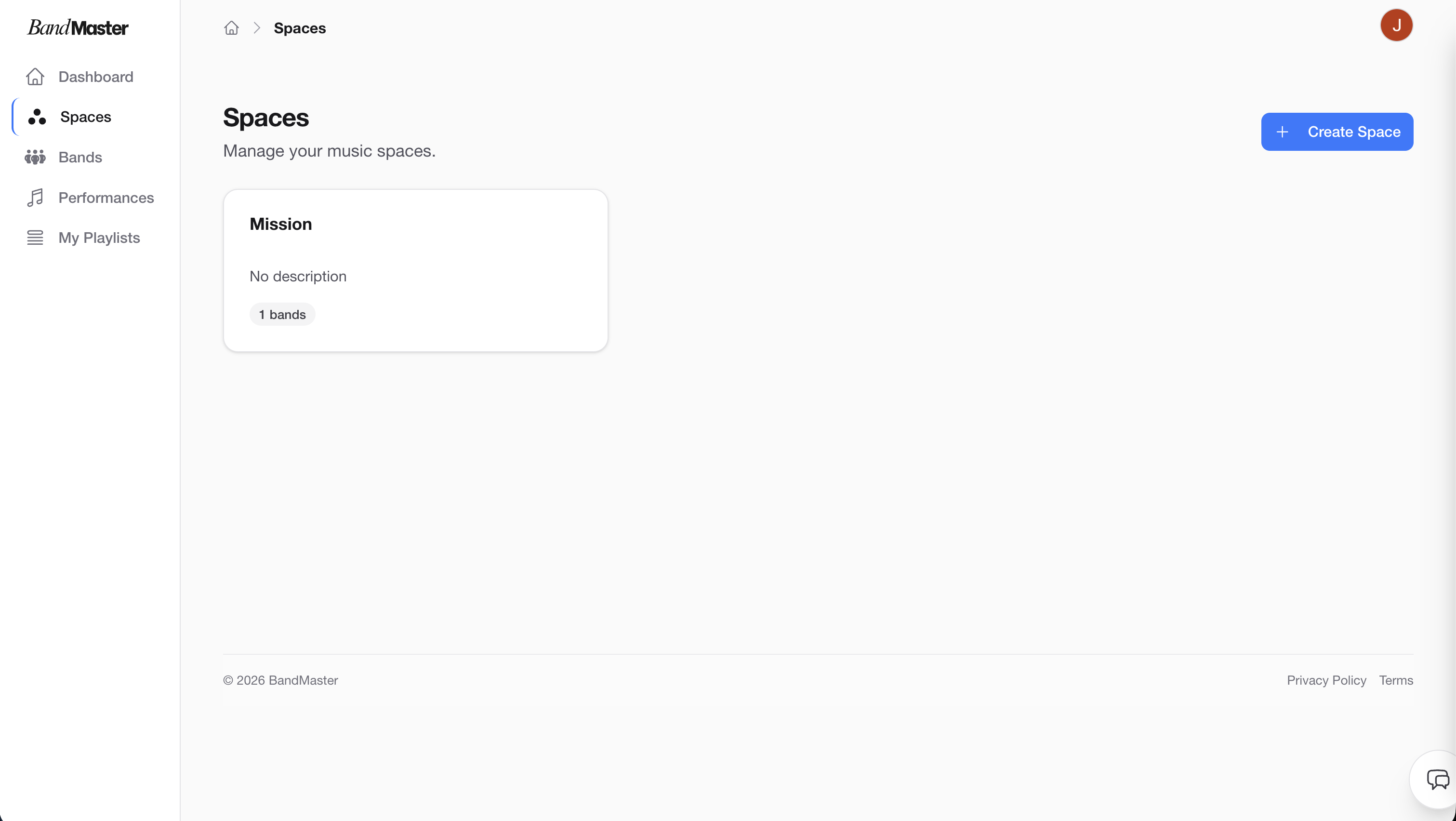 A Space is the top-level container in Bandmaster. Think of it as your organization — a church, a school music department, a venue, or a band management company. Everything in Bandmaster — bands, performances, and members — lives inside a Space.