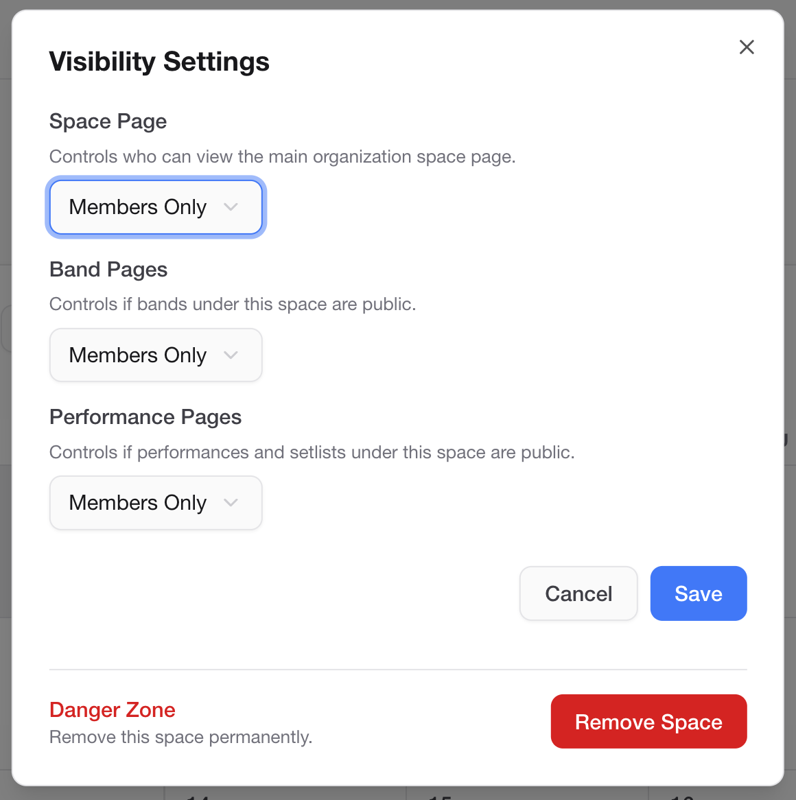 Warning: Deleting a Space permanently removes all bands, performances, and associated data. This cannot be undone.